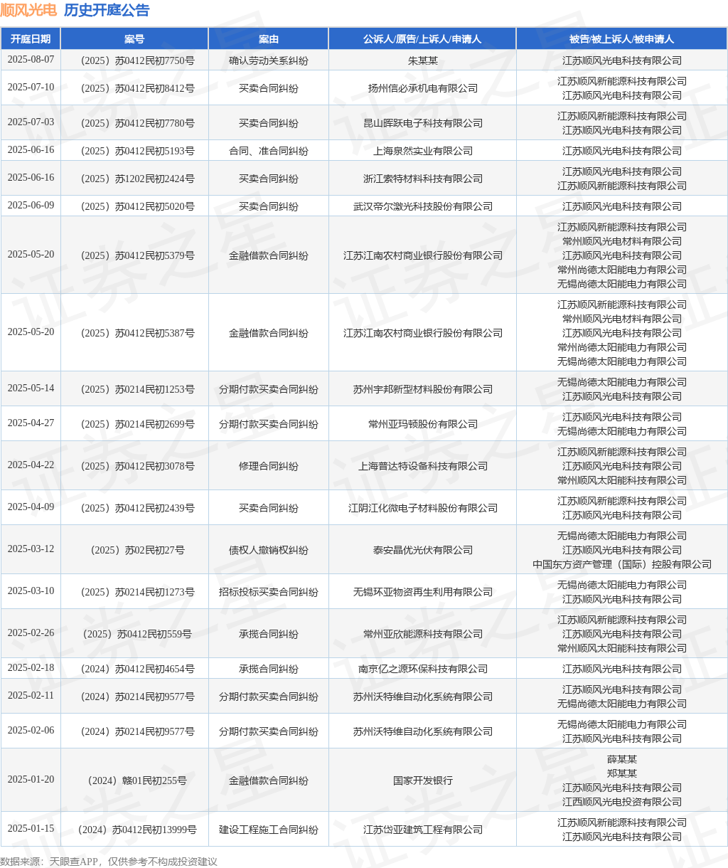 案号:(2025)苏0214民初1253号审理法院:无锡高新技术产业开发区人民法院案由:分期付款买卖合同纠纷当事人信息: 原告/上诉人:苏州宇邦新型材料股份有限公司 被告/被上诉人:无锡尚德太阳能电力有限公司、江苏顺风光电科技有限公司开庭日期:2025年5月14日根据统计,近一年内以江苏顺风光电科技有限公司为当事人的历史开庭公告有33则,其中案由为“买卖合同纠纷”的公告以11则居首,其次为“分期付款买卖合同纠纷”有7则,“承揽合同纠纷”有4则。历史开庭公告(前20条)如下: